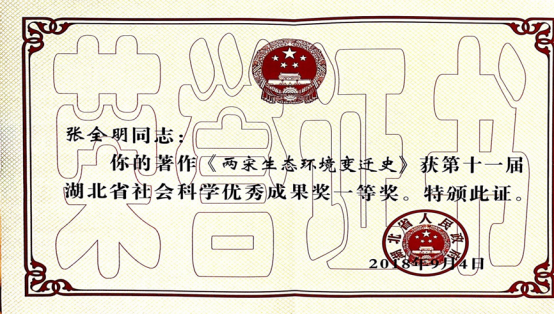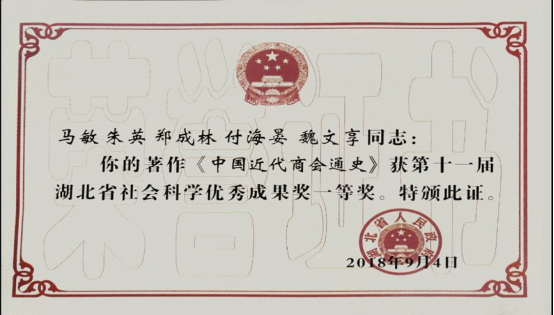 日前,教育部正式公布了第八届高等学校科学研究优秀成果奖(人文社会科学)评选结果。8040威尼斯最佳登录喜获两项优秀成果奖:中国近代史研究所的马敏教授主编、马敏、朱英、郑成林、付海晏、魏文享等教授合著的四卷本《中国近代商会通史》荣获“著作论文类”二等奖;中国古代史教研室的张全明教授独著的《两宋生态环境变迁史》(上下册)荣获“著作论文类”三等奖。这两部著作在2018年并肩荣获第十一届湖北省社会科学优秀成果奖一等奖,此次又同时斩获更高级别的奖项。