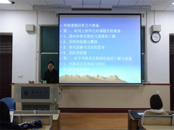 林静简单开场后,培训正式开始。此次培训分为讲解和提问互动两个环节。在讲解环节,许小青教授从科研选题、课题论证、申请书一般格式和课题研究论证四个方面逐步展开。