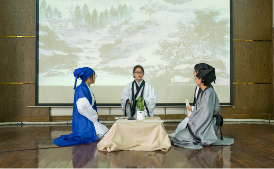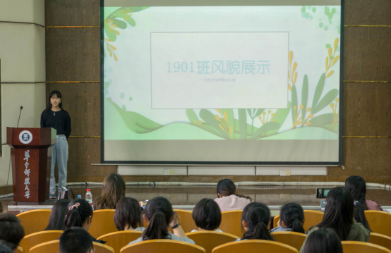 随后展示的是1901班,刘欣雨从班级特色活动和班级成员荣誉两方面进行风貌展示,通过介绍笔记竞赛、庆生活动、读书会等特色活动,来体现班集体建设成果。之后他们进行了才艺展示——情景剧《春风化雨》,表演了孔子游春的情景,并搭配诗朗诵,展现了丰富的才艺表演形式。