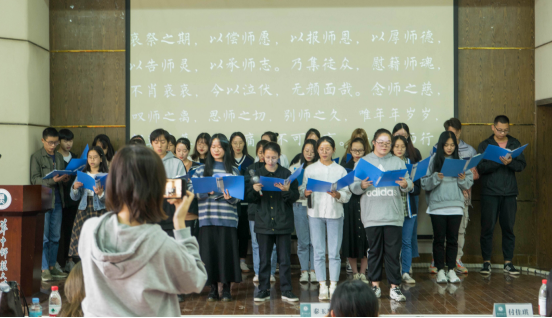 点评结束后,第二组的展示继续进行。1902班首先出场,吴文慧不仅从班级状况、师范生生活、学生生活这三个方面进行了介绍,而且通过视频的形式展示了班级同学对未来的美好祝福。接着,他们带来了诗朗诵——《岁月如梭,师魂永恒》,从三个阶段的演变歌颂了教师的高尚品德,展现了师魂的永恒。