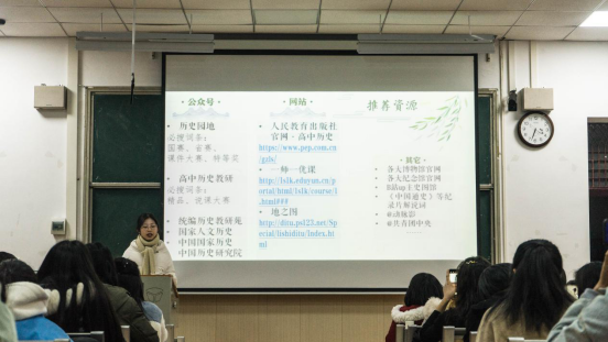 介绍完课件制作的设计技巧后,陈荟鹦为同学们讲解了课件制作在真实课堂中的运用。她提出,课件背景以浅色为佳;课件上不要出现多余的字句,呈现的材料一定要充分使用;使用翻页笔有利于观察学生的反应;遇到无法使用课件的情况,要充分利用板书和课本;当讲到重点内容时,要提醒同学们做笔记。
