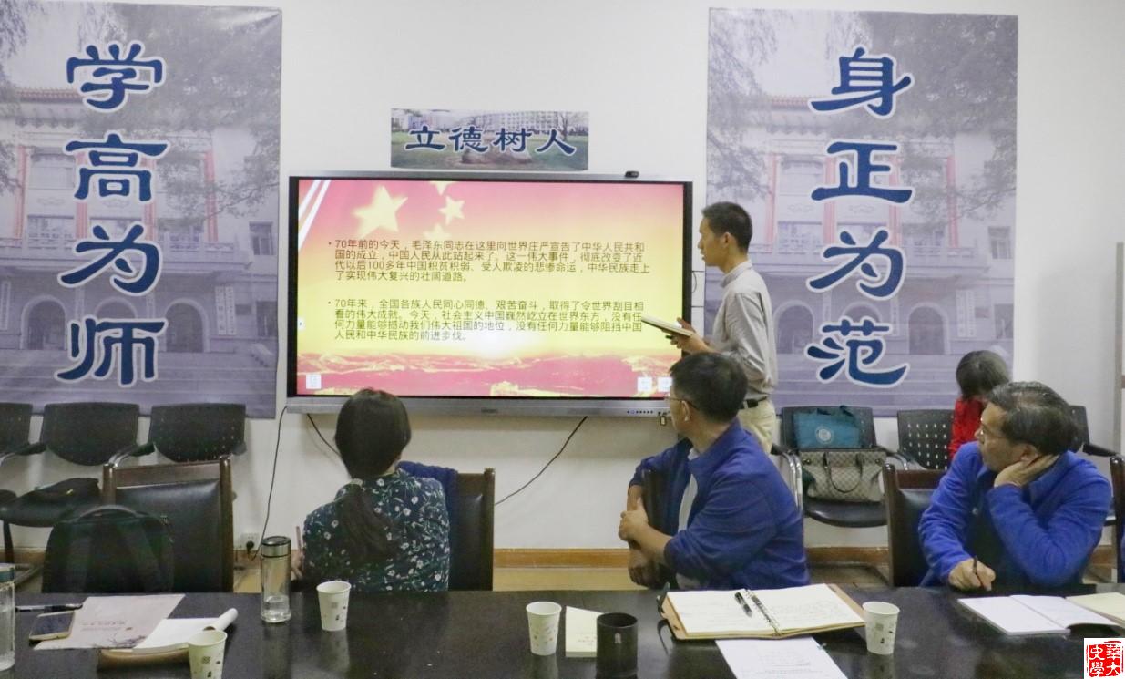 接着,中国近现代史教研室党支部书记李明领学《习近平总书记在庆祝中华人民共和国成立70周年大会上的讲话》。他认为,习总书记的讲话深刻阐明了新中国成立的历史意义与70年来中国共产党带领人民创造的伟大功绩,讲话言简意赅,铿锵有力,极大鼓舞了全国人民为实现“两个一百年”奋斗目标、实现中华民族伟大复兴的中国梦而努力奋斗的决心和信心。大家要深刻领会习总书记讲话精神,树牢“四个意识”,坚定“四个自信”,坚决做到“两个维护”,不忘入党初心、牢记党员使命。
